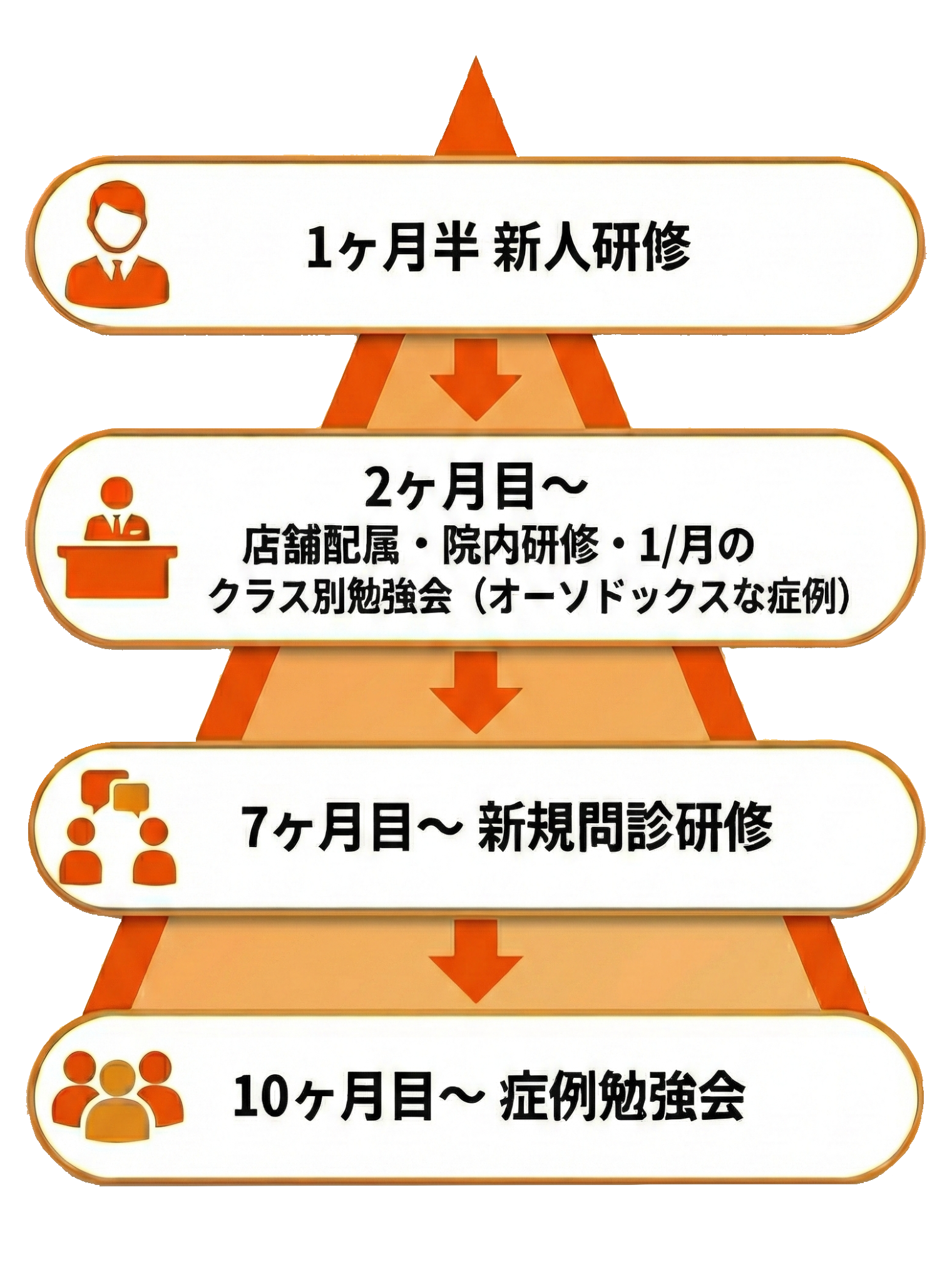 現場配属が決まり店舗に出たら、院の環境にまず慣れてもらいます。 電話対応から施術の補助までまずは実際の現場に慣れましょう!!